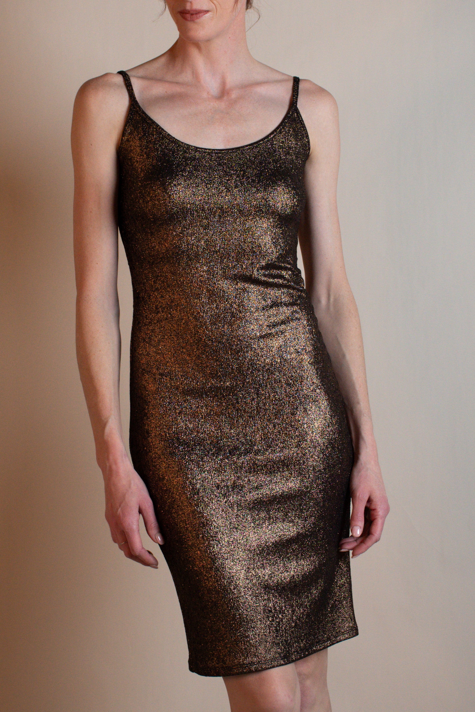 This metallic printed cami dress is made of slinky jersey that has fantastic stretch and hold. The finish is a foil printed copper color that has a beautiful copper shine printed in a distressed linear style.