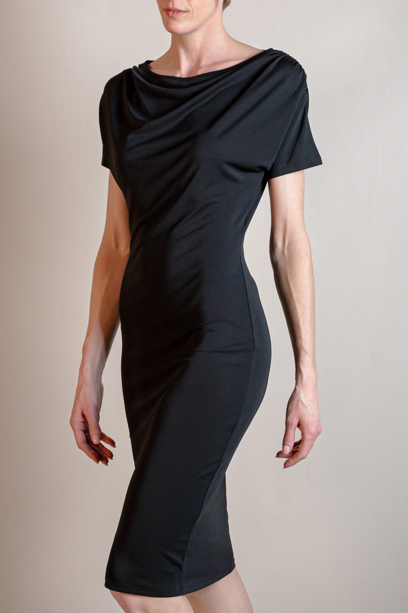 The Eloise dress is made from a wrinkle-proof fabric perfect for traveling! flattering and slimming, the body hugs the midsection, while the shoulder gathers allow for a drape or an off-the-shoulder look.