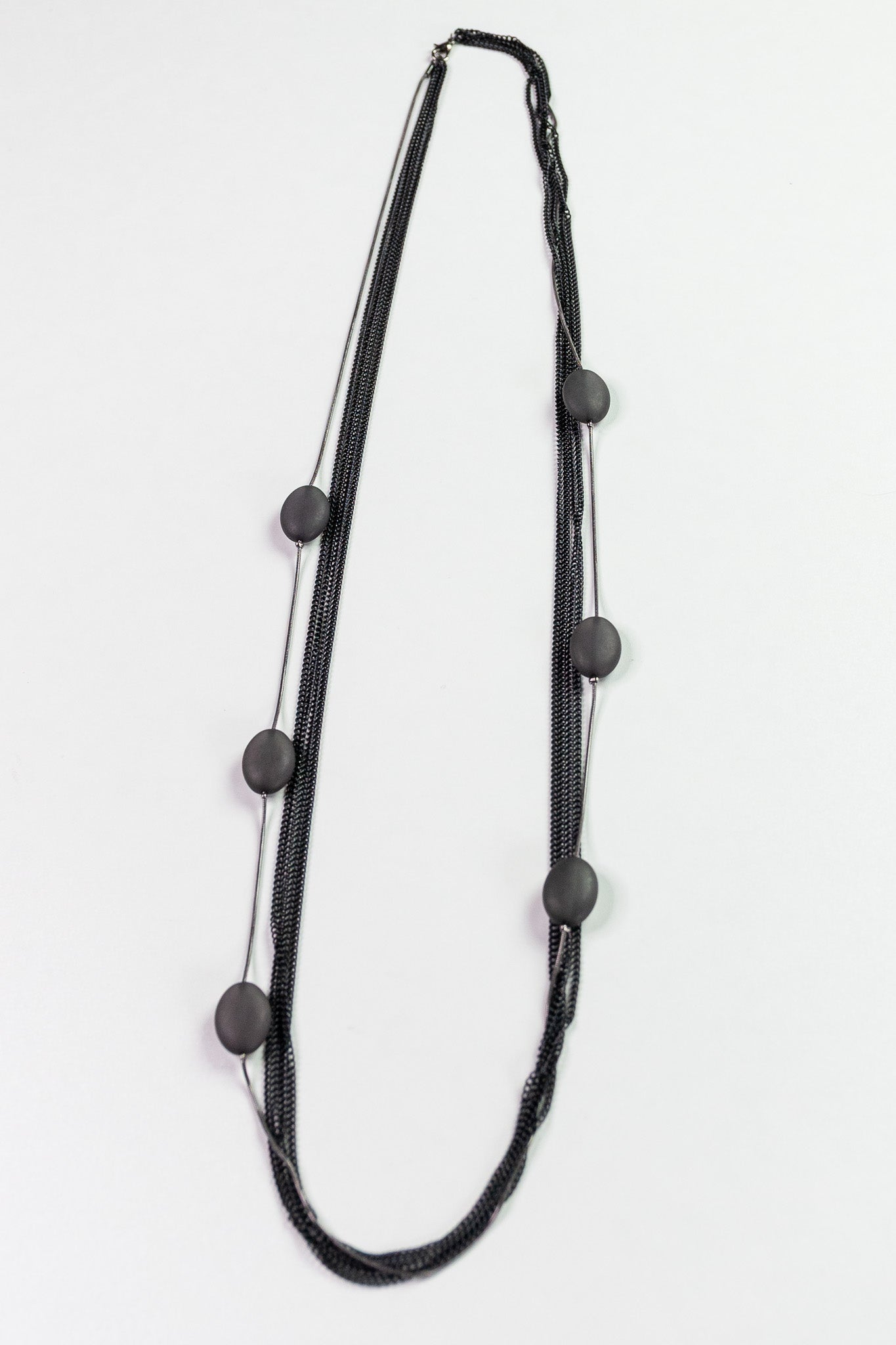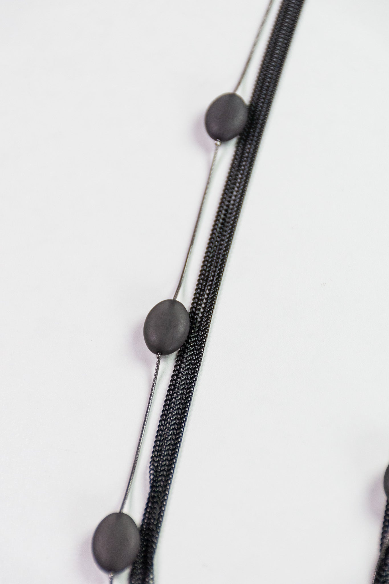 An extra long necklace that features four black chains and one gunmetal chain accented by semi-opaque charcoal color beads.
