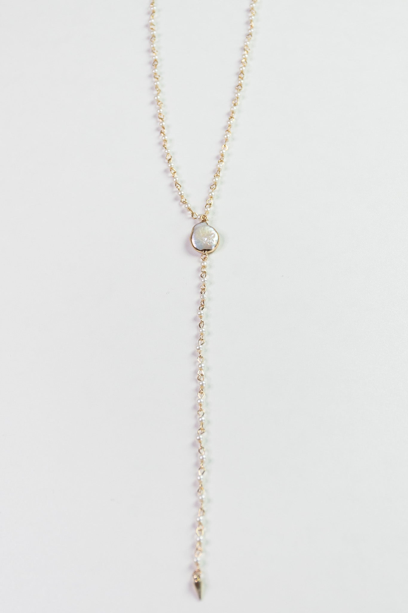 A long gold necklace accented with small pearls connecting to a mother of pearl forming an elegant and beautiful statement piece. Wear this necklace to dress up any outfit.