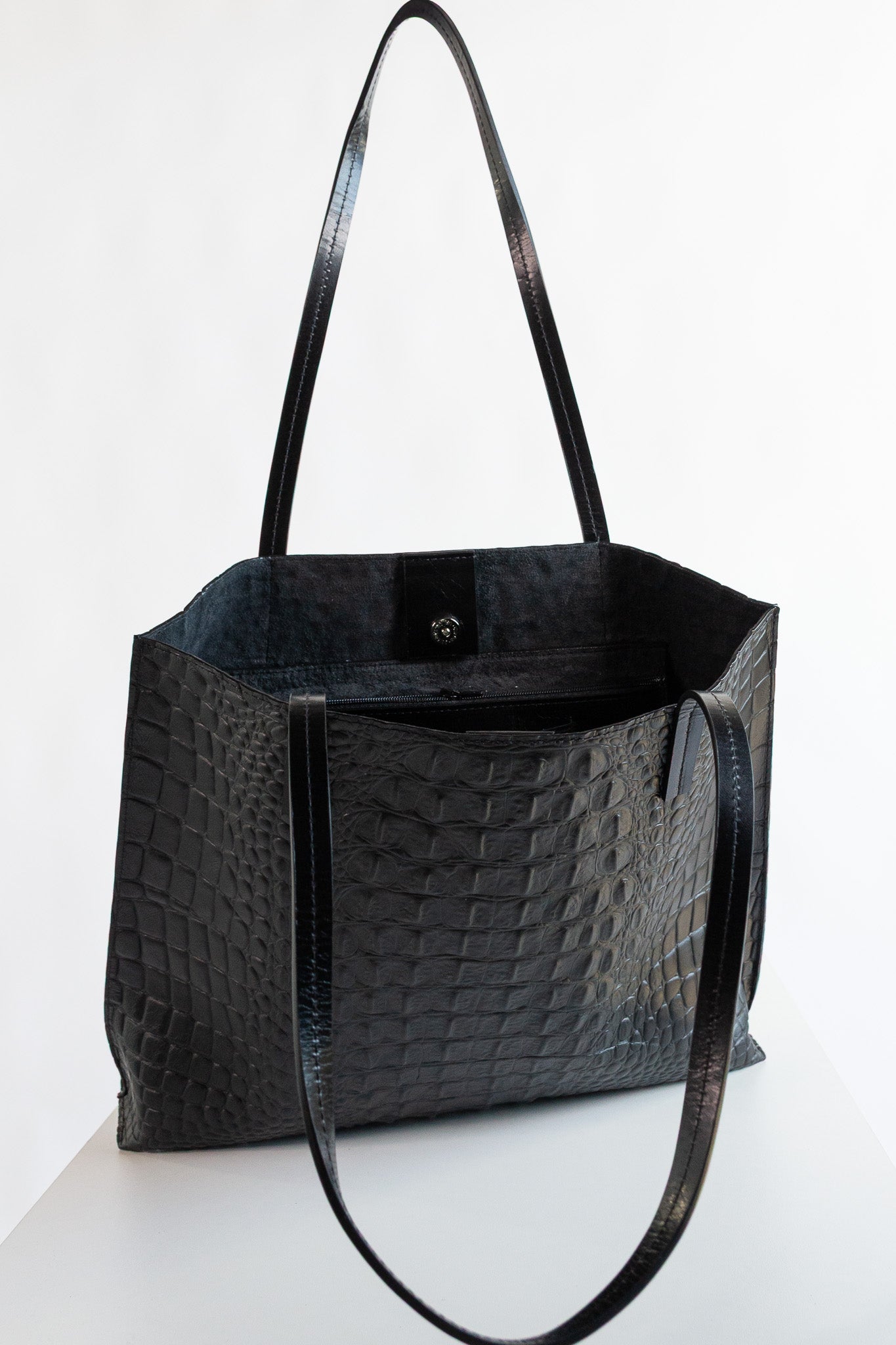 The perfect medium sized bag that will carry the essentials and then some! Made in a lovely embossed crocodile leather, this shopper features interior pockets (one with a zip closure), and a magnetic clasp.