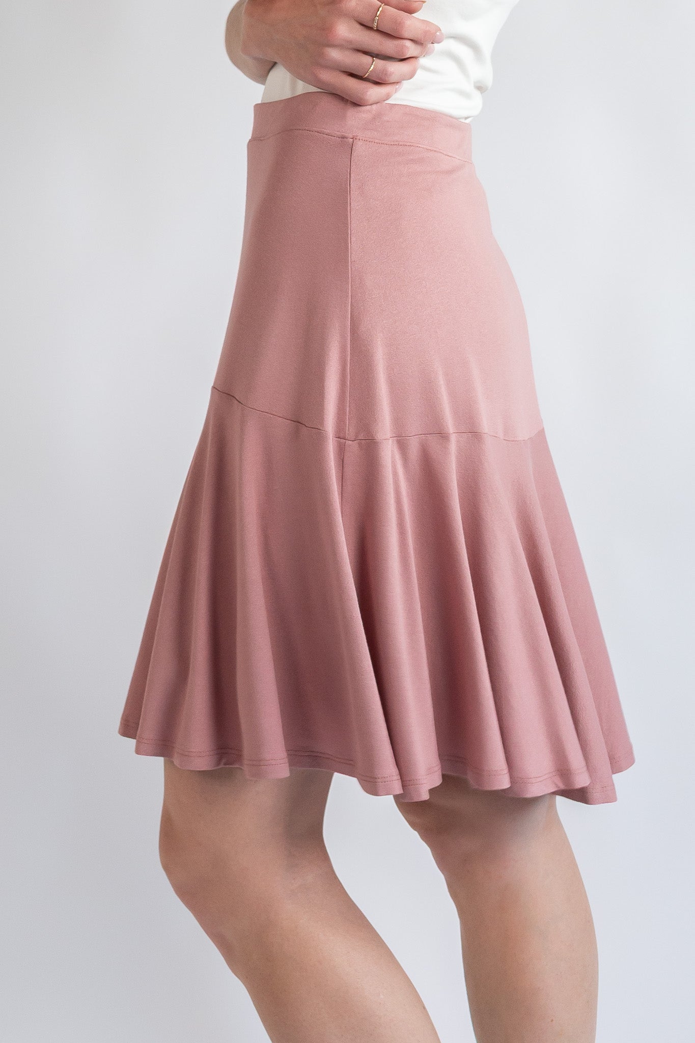 The Wilder Skirt is a flowy skirt made from double lined knit crepe. It features an elastic waistband and a tiered design with a flounce effect. This skirt falls just above the knee.