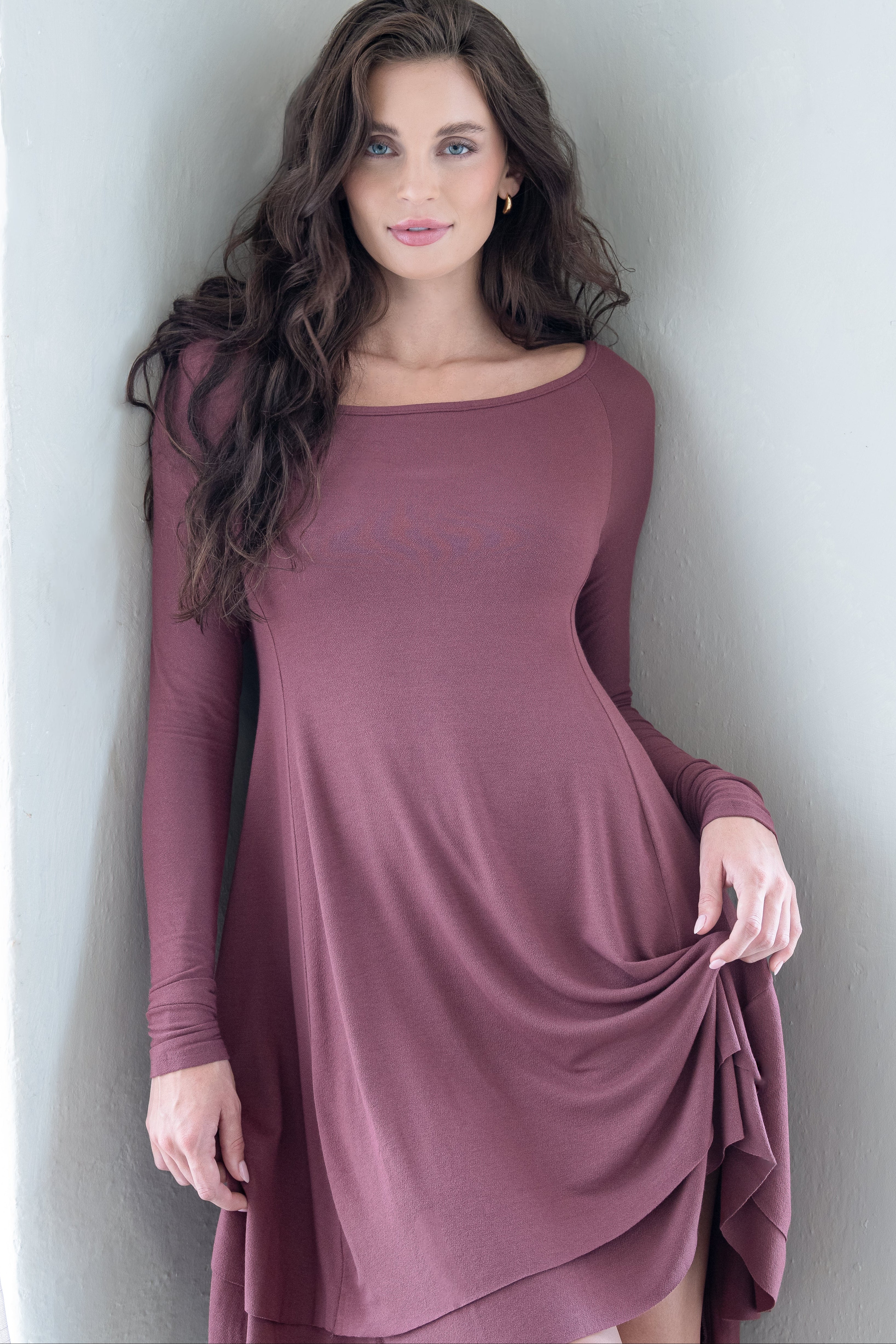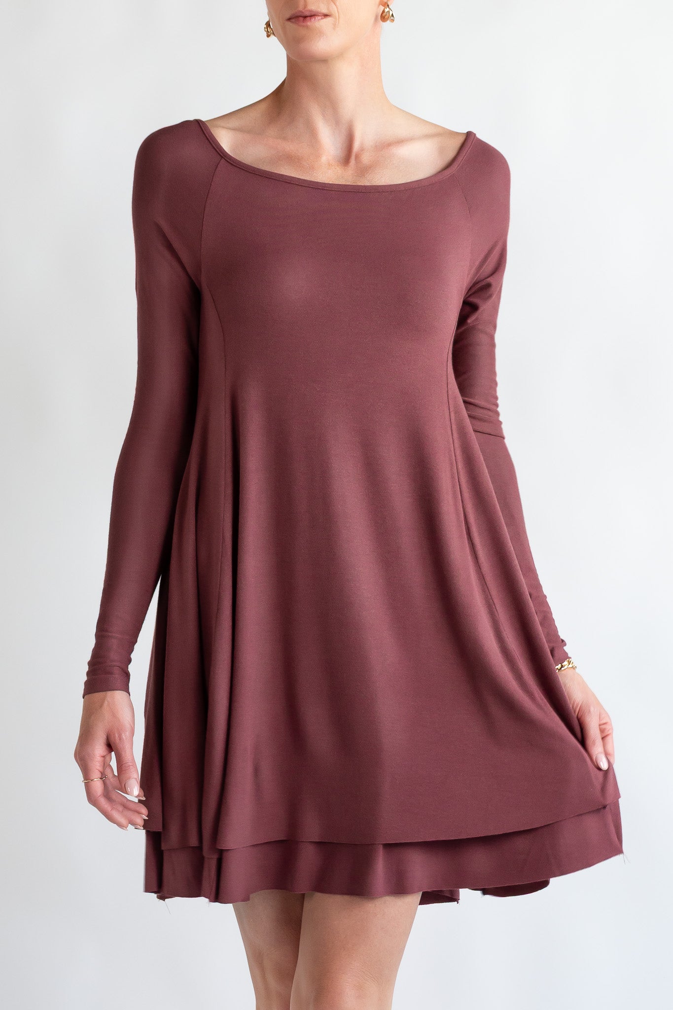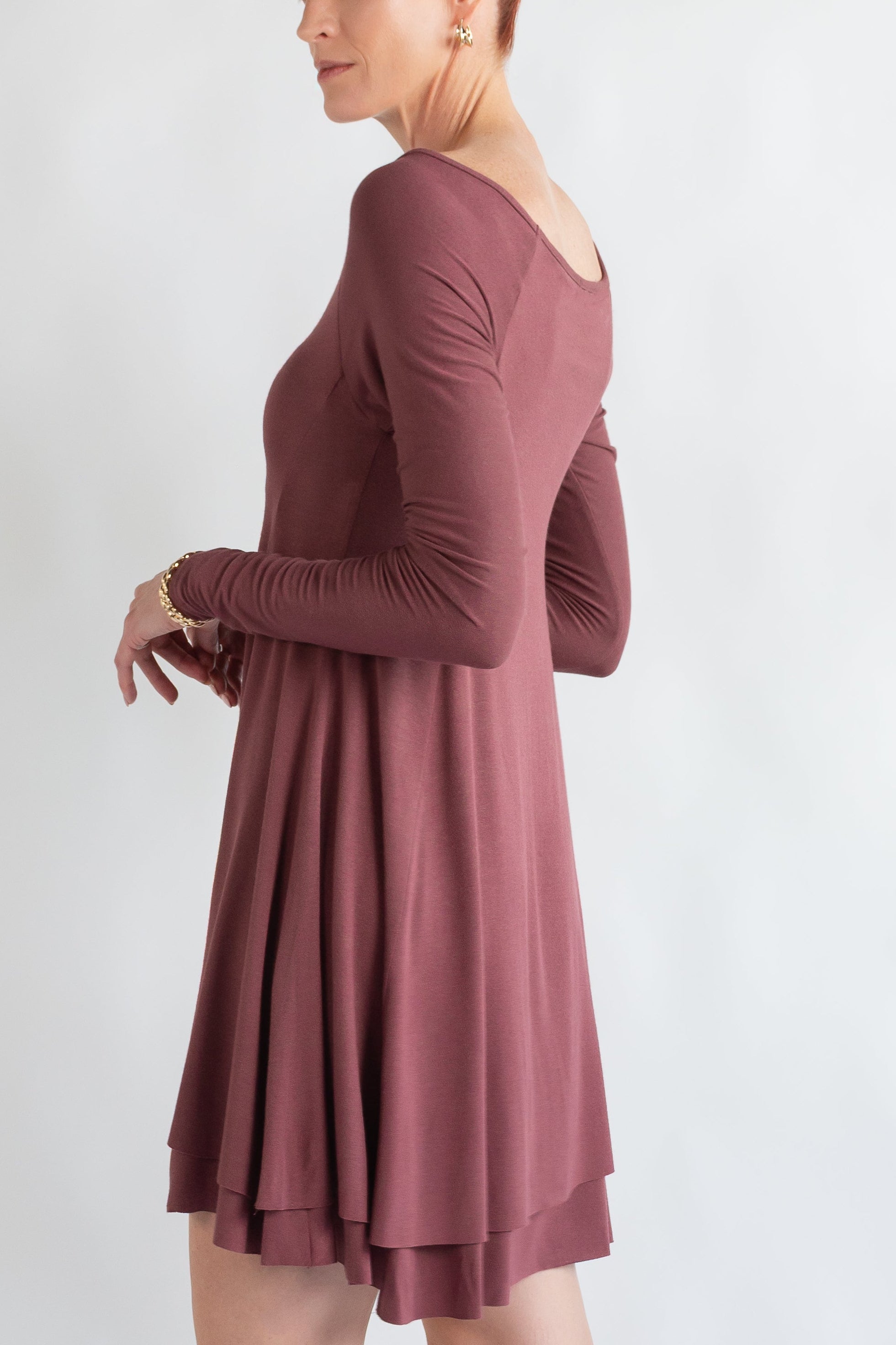 This soft crepe dress is double layered. has long sleeves and is a style that can be worn as a very wide ballet neck and also off the shoulder. Short and sweet, the body is fitted at the bust and falls full to the thigh, slightly lower in the back. Available in XS - XL Made in Michigan