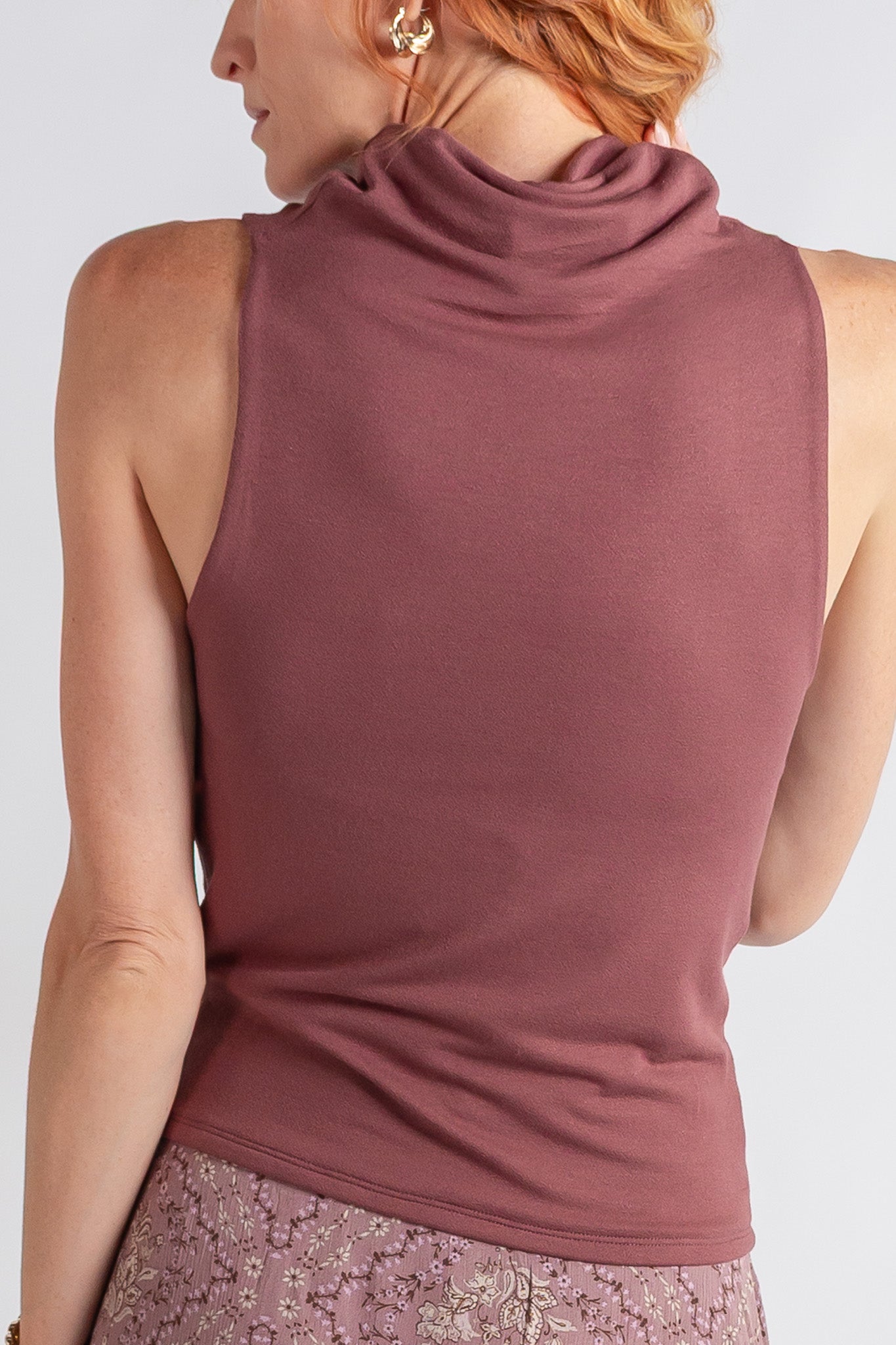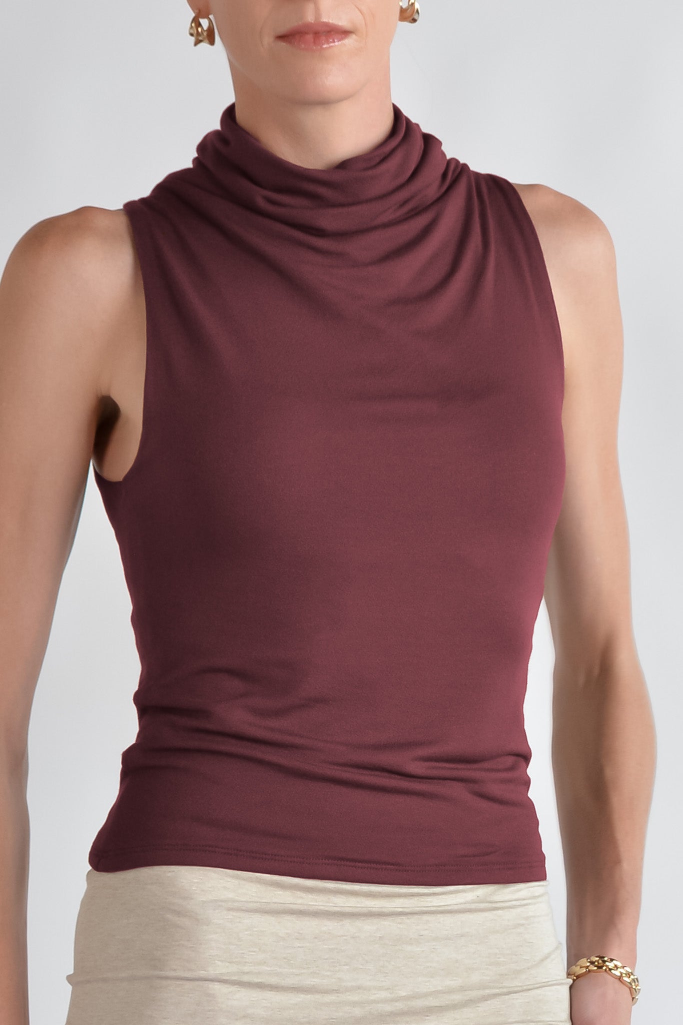 This sleeveless crepe top is double layered, giving it a light, textured look with the security of knowing your smooth and covered. The soft knit fabric drape around the neck and the hem hits just above the hip.