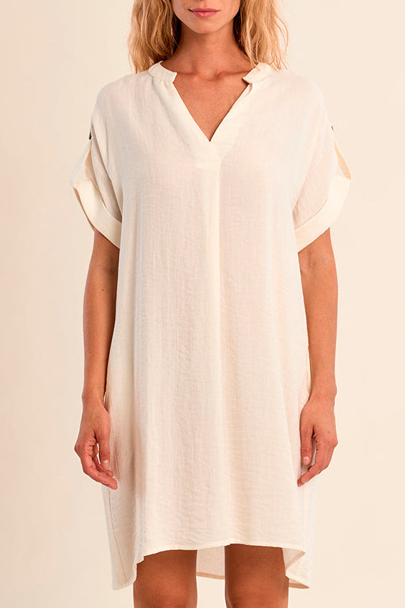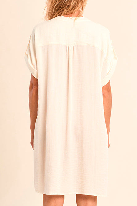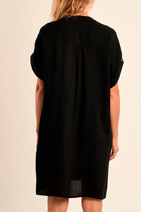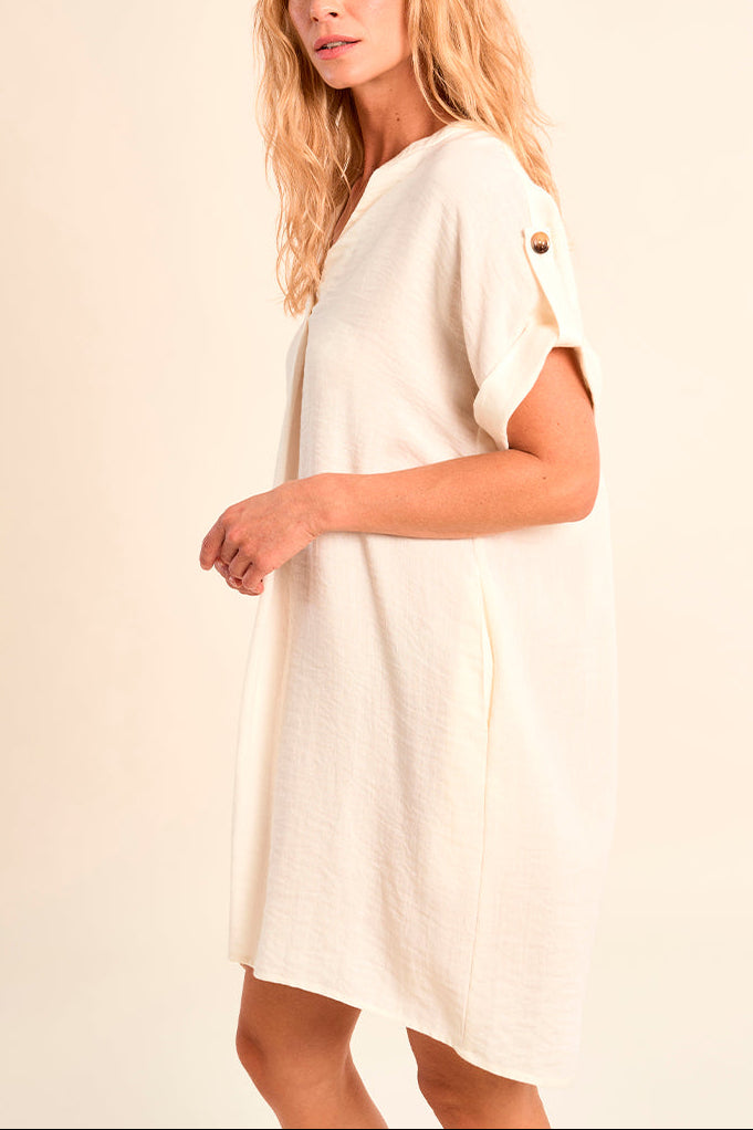 The Woven dress by Molly Bracken has a rolled short sleeve with button detail. This shirt dress style has a V-neckline, pockets, and a pleated back for a loose fit, soon to be your go-to dress for everyday style.
