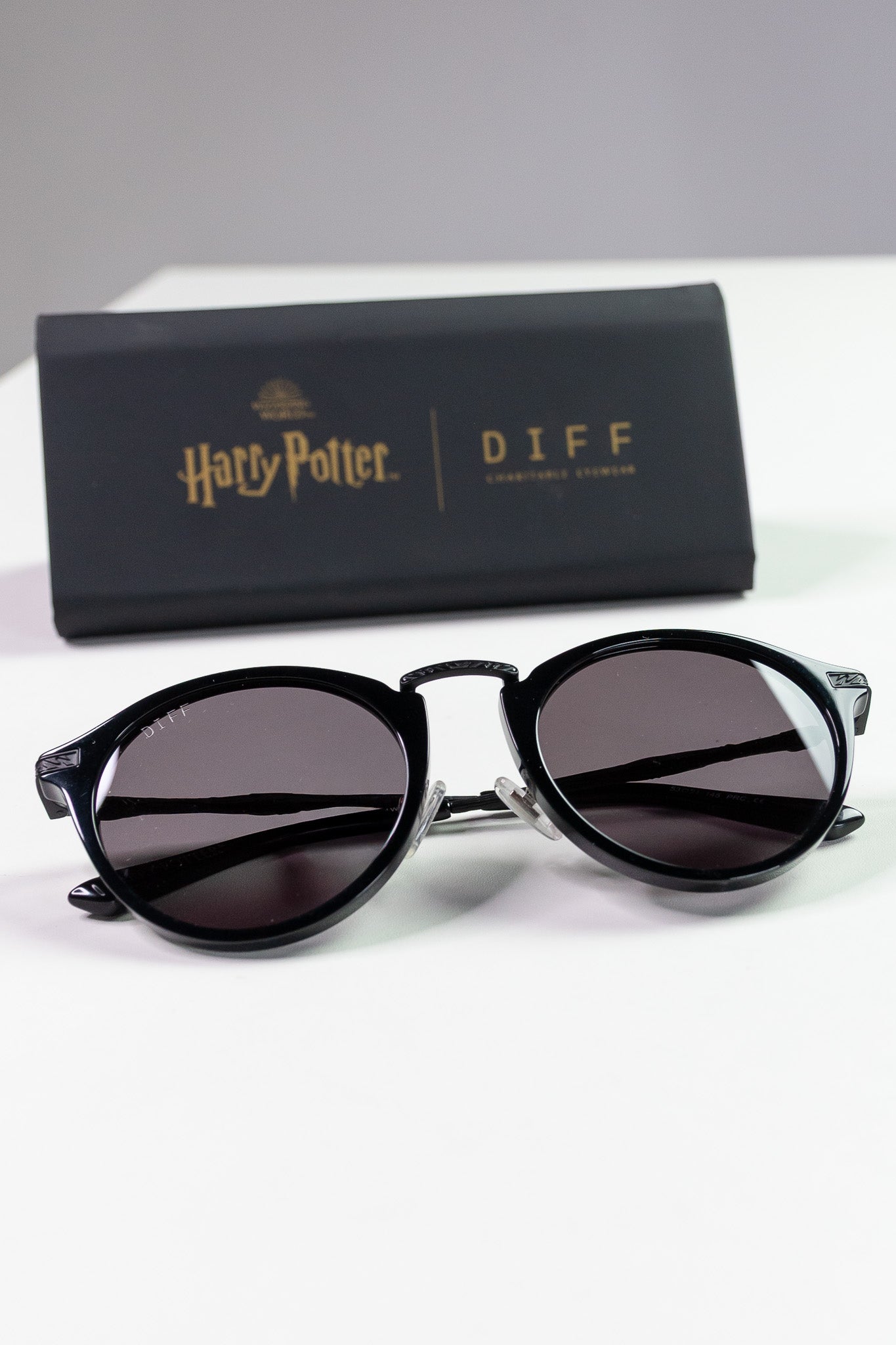 Enter the "Wizarding World" of Harry Potter wearing DIFF's iconic new sunglasses! Designed in a round hand-cut acetate and stainless steel frame, these sunglasses feature unique arms made to look like wands and are accented with a lightening bolt at the end. Crafted in a sleek tuxedo black frame and Yule Ball grey lens made of premium scratch resistant polymer. These glasses come with a black travel case with the Harry Potter emblem stamped on the front and symbols on the interior. Also comes with a logo cleaning cloth.