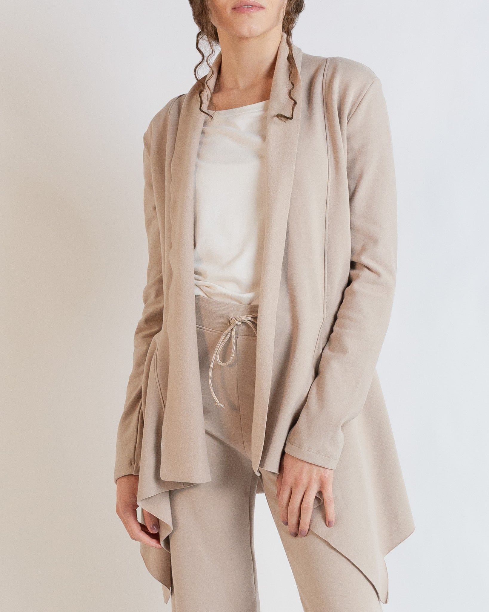 The Jute Jacket by Revir is a signature investment layer, designed for enduring style and elevated comfort. Crafted from responsibly sourced bamboo cotton fleece, it offers a lightweight yet cozy feel with exceptional softness and breathability. Thoughtful details like long sleeves, a clean front panel, and a fluid handkerchief hemline create a relaxed silhouette that moves effortlessly from everyday wear to dressed-up moments and travel. Timeless, versatile, and consciously made—this is an essential, perfected. Pair it with the Mina Leggings or lounge pant for a travel-ready, elevated layering look that moves seamlessly from home to life on the go.
