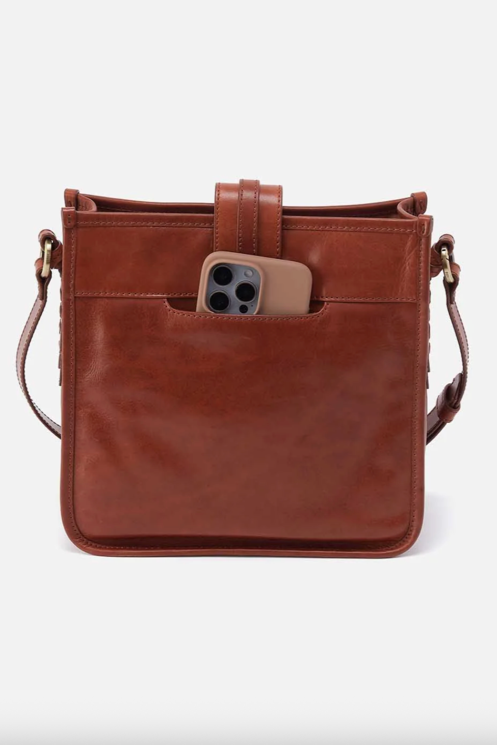 Take this bag on your next expedition with its compact and capable design! Featuring a deep interior with pockets on both sides and a luxurious patina leather, this bag will hold your essentials and then some. This lovely bag also features an exterior phone pocket, a magnetic closure with a darling woven detail, and an adjustable crossbody strap.